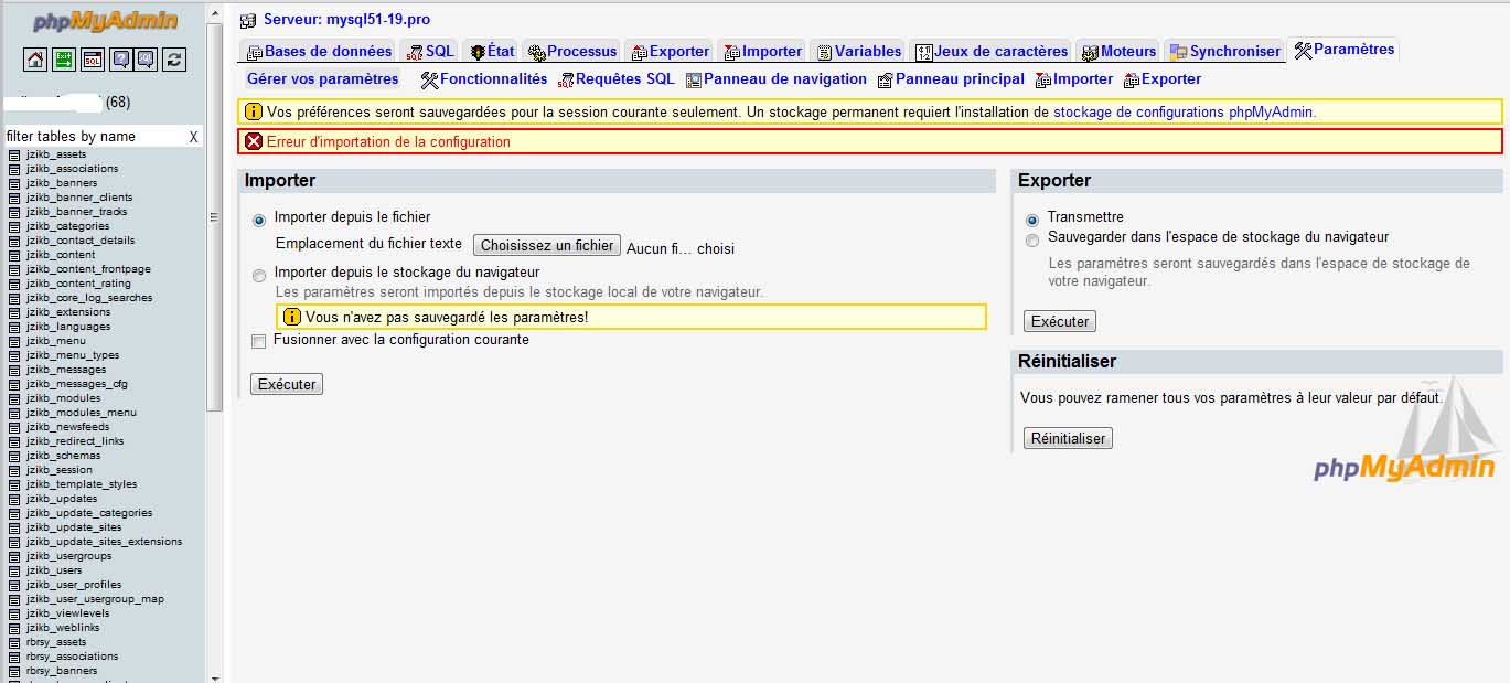 Depuis tout à l'heure j'essaye de mettre à jour ma base de données. J'ai été dans mon site local, j'ai exorté la base. J'ai été sur sur la base de données en ligne sur mon hébergeur, pour importer la base de données qui est sur mon disque dur. Mais voilà ce que j'ai comme message : "vous n'avez pas sauvegardé les paramètres!" Je joins une copie écran pour être plus claire.