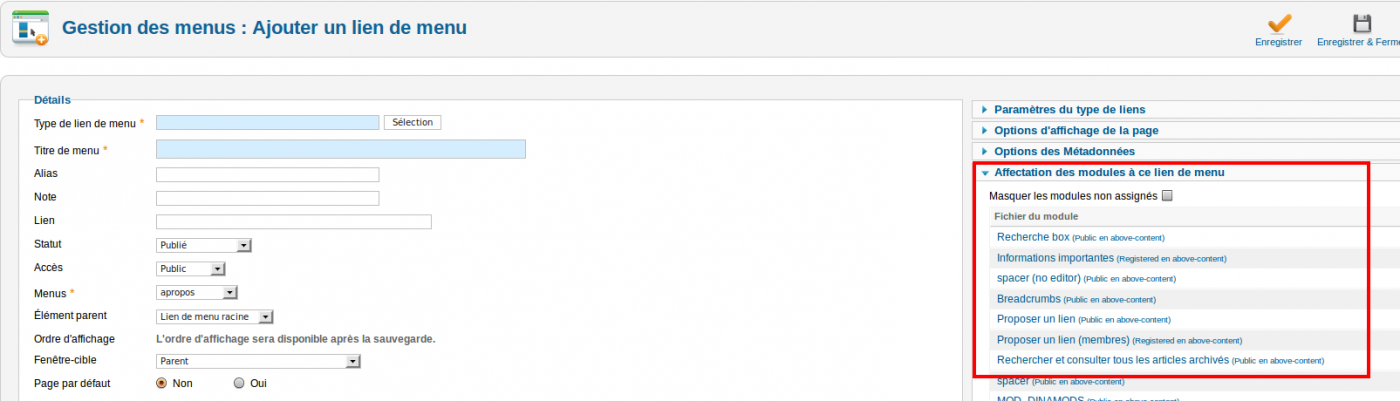 J'ai un problème que je n'arrive pas à solutionner : les composants s'affichent dans le "Menu d'Assignement" des modules (du style - - com_banners, - - com_weblinks_categories, etc.) !