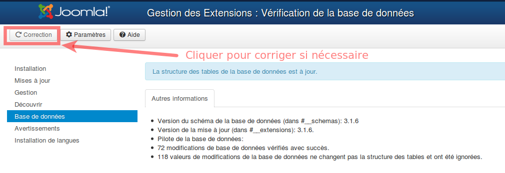 4) Correction base de donnée via "gestion des extensions"