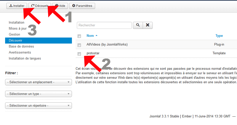 Aucune extension n'a été découverte. Cliquez sur 'Découvrir' pour chercher de nouvelles extensions pouvant être installées ainsi.