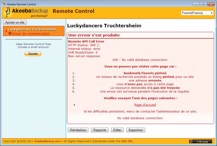 - Avec Akeeba_Backup_Core 3.2.7, la sauvegarde plante lorsque je veux effectuer une sauvegarde complète (base de données et fichiers) mais fonctionne lorsque je sauvegarde uniquement les fichiers. Je sauvegarde avec Backup_Remote_Control_4.08 et le message d’erreur est le suivant : « 500 – No valid database connection ». J’ai essayé plusieurs paramètres au niveau de la config du composant. Mais rien n'y fait. Vue avec O2Switch, mon hébergeur, et il ne semblerait pas que ce soit un problème de version du PHP ou SQL. De plus, elle marchait déjà avec Joomlapack.