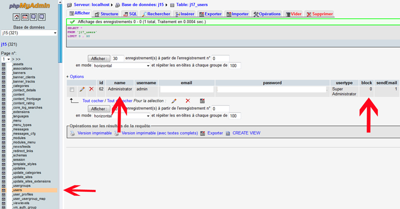 Tu doit te rendre dans ta base de données, table jos_user, et vérifier