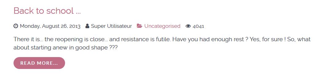 - avec la "particle" Joomla articles, seuls des articles de certaines catégories stipulées seront affichés. Le style utilisé n'est plus du tout le même. Pas d'accès possible aux icônes "email", "print" mais seulement les informations relatives à l'article en dessous du titre.