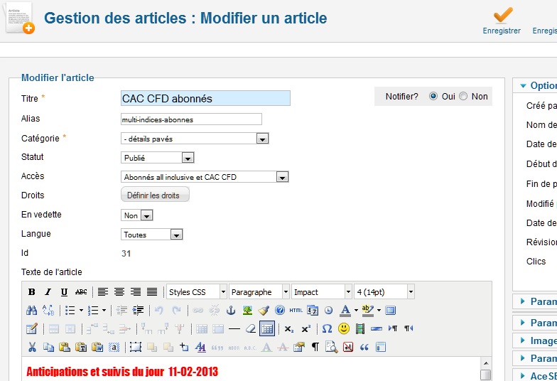 Il y a vraiment des trucs que je ne pige pas et d'autres que je n'aime pas ! Au rayon de ceux qui cumulent les 2, la disparition de l'info "notifier : oui non" dans la gestion des articles, comme dans l'exemple ci-dessous :