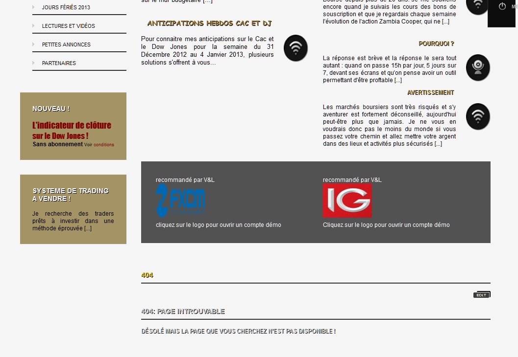 Je me suis emballé trop vite je crois ! Il y a du mieux certes, mais cette page 404 apparait en bas de la page dès que je me logge ! J'ai désactivé l'article 404 mais bien que désactivé, il est toujours là et je ne sais pas pourquoi ?!