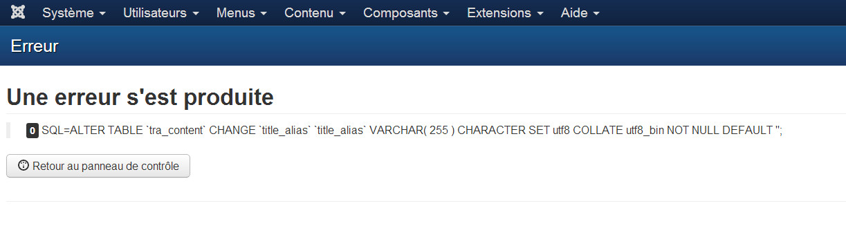 La table 'tra_content' ne contient pas la colonne 'title_alias' etc...
