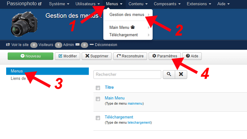 Contenu ==> gestion des catégories ==> paramètres ==> catégorie
