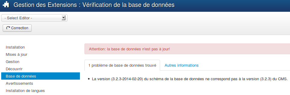 Suite à la MAJ vous constaterez via la gestion des extensions : Vérification de la base de données, cette alerte