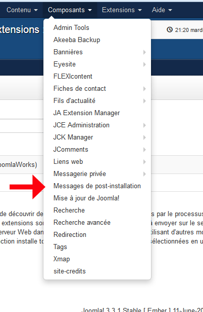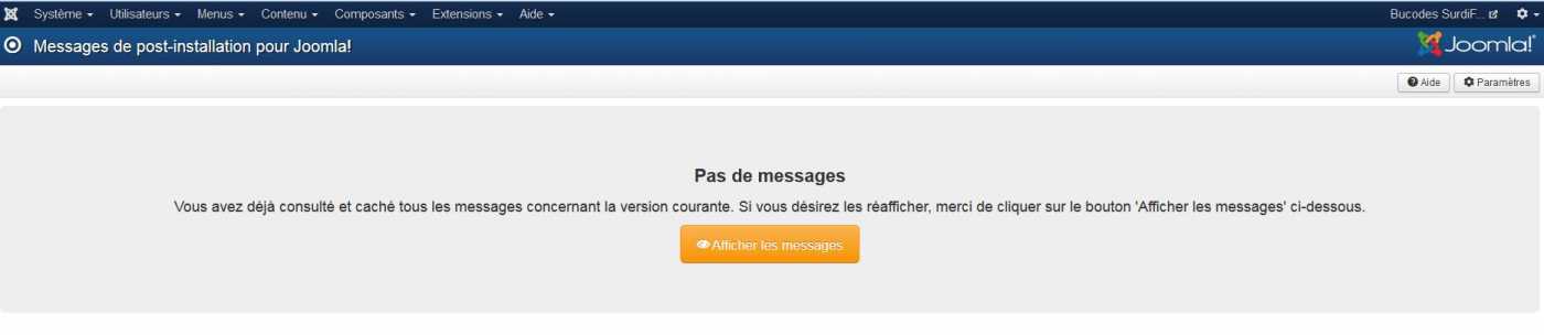 Il me reste encore un petit truc à résoudre. Le cadre bleu m'indiquant que j'ai un message post-installation est toujours en place, en dépit d'une purge du cache. Lorsque je clique sur l'onglet "Composants", puis "Message de post installation, j'ai la fenêtre suivante. Est-ce que j'aurai dorénavant tout le temps le cadre des messages post-installation au-dessus du menu où je fais ma sauvegarde ?